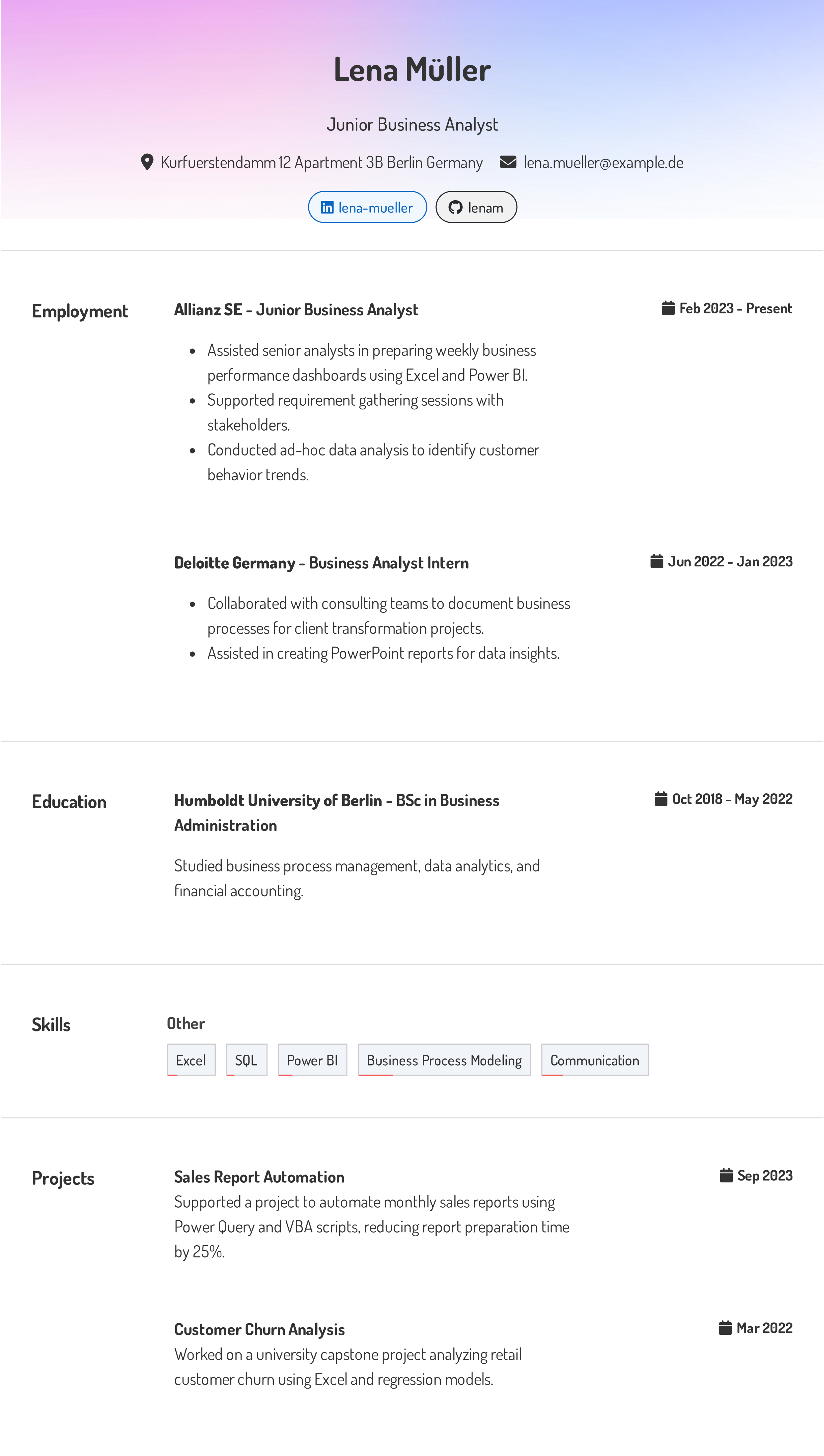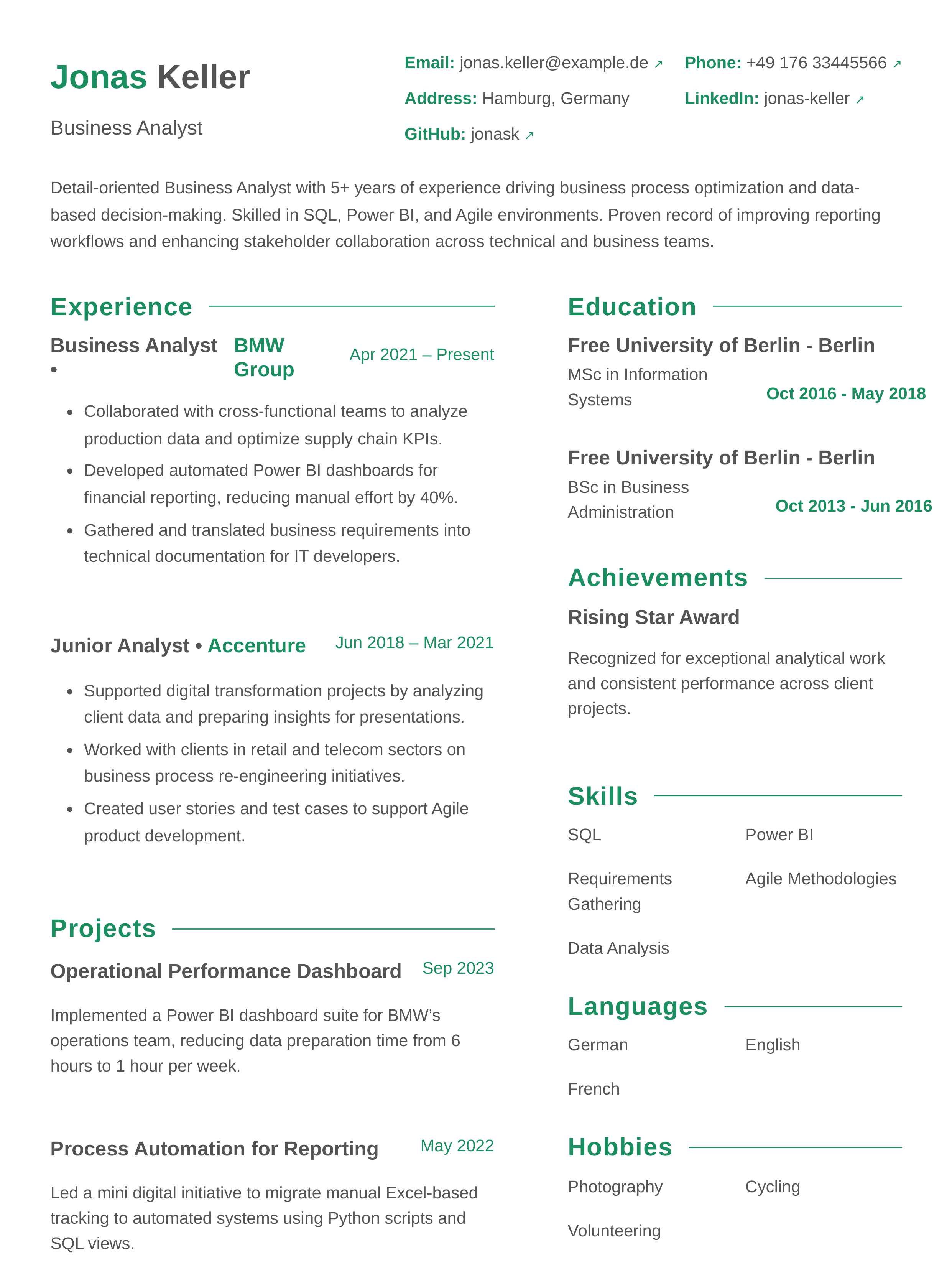 Clear and concise entry-level resume highlighting internships, analysis projects, classroom case studies, and problem-solving outcomes. Built to showcase curiosity, analytical rigor, and familiarity with industry-standard tools, even with limited work experience.